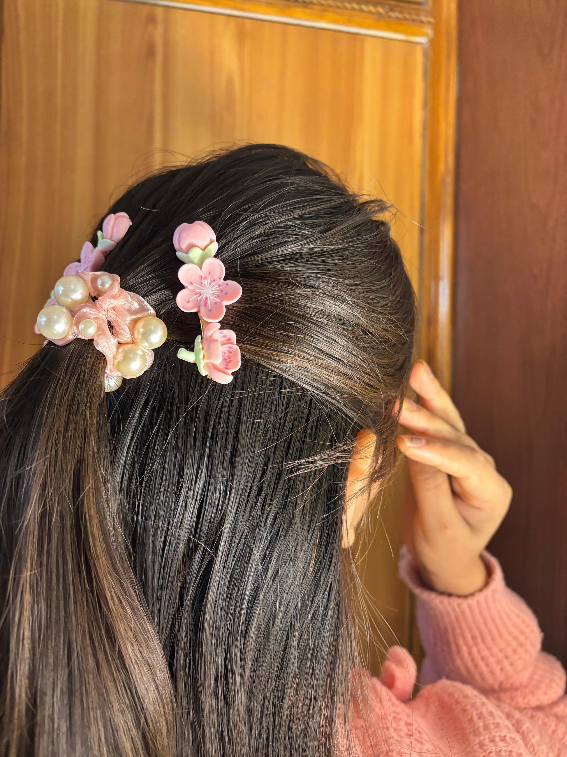 - Pink pearl scrunchie β Satin scrunchie with pearl embellishments.