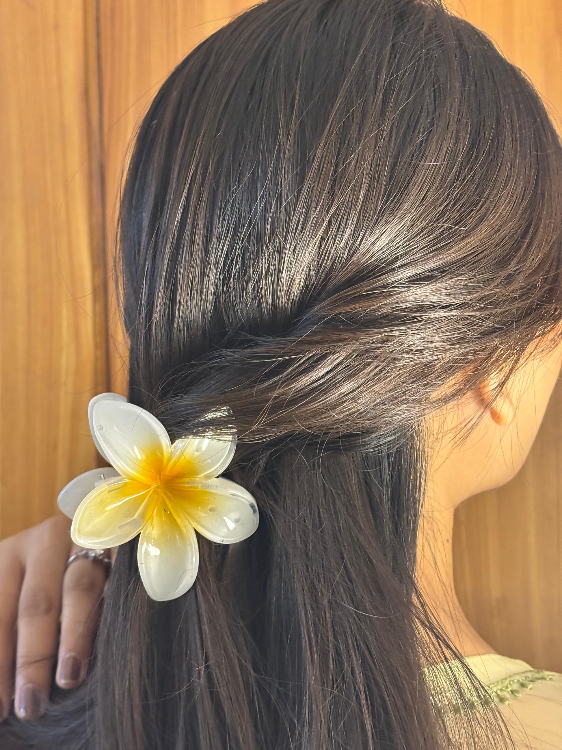 - White-yellow translucent flower hair clip β Dual-tone floral hair accessory.