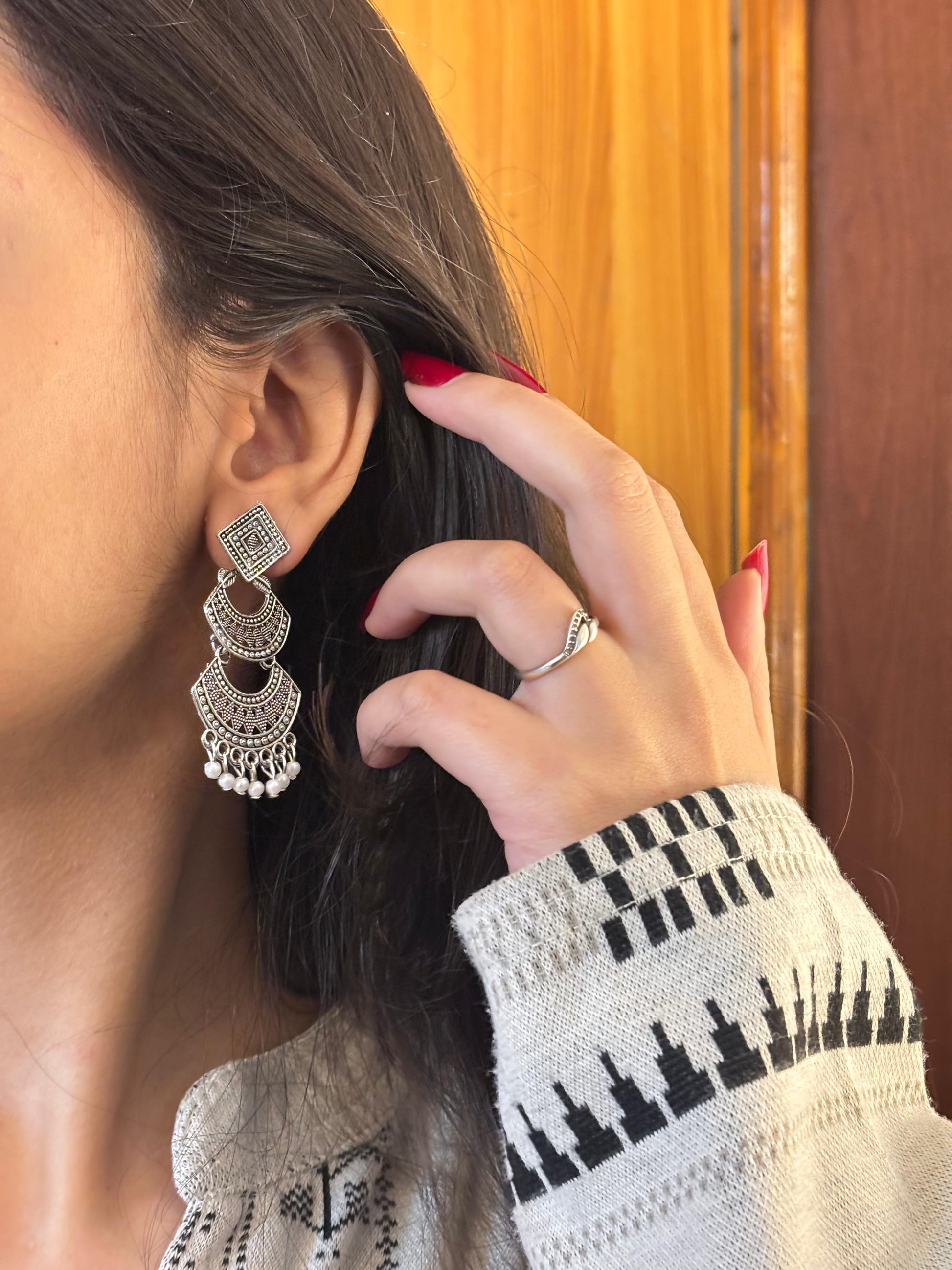 - Oxidised square jhumka earrings β Square engraved stud with layered dangling beads.